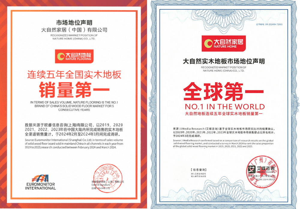 大自然家居全球布局9大原材料供應(yīng)基地和6大集約化智造基地,為未來地板、木門、櫥柜、衣柜以及整家定制等產(chǎn)品的產(chǎn)能做出了精心布局,投入集約化、智能化、自動化、信息化的高水平生產(chǎn)基地的建設(shè),助推中國健康家居行業(yè)的發(fā)展。2024年3月,全球優(yōu)秀的權(quán)威機構(gòu)歐睿咨詢和艾媒咨詢分別發(fā)布統(tǒng)計數(shù)據(jù),表明大自然實木地板在2019年至2023年連續(xù)五年蟬聯(lián)“全國實木地板銷量第一”和“全球?qū)嵞镜匕邃N量第一”的榮譽,展現(xiàn)了大自然家居在國內(nèi)外市場的強勁實力。