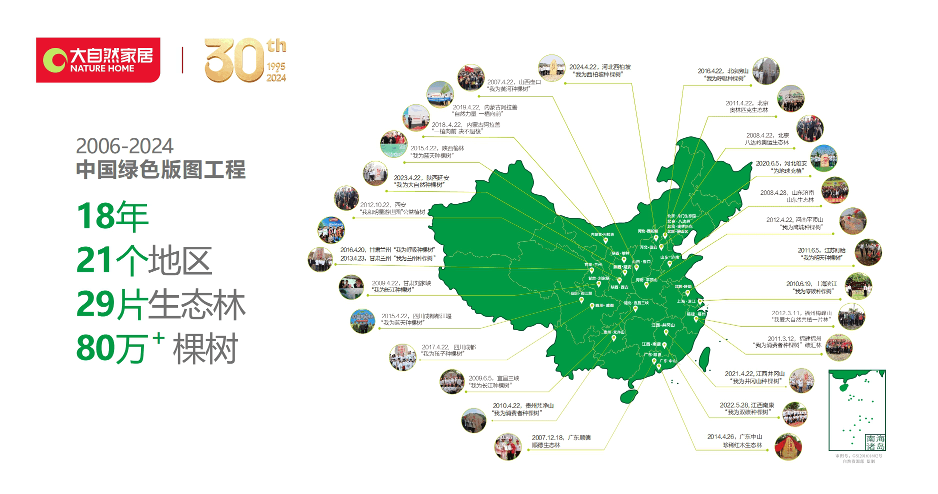 4月22日,大自然家居攜手中國綠化基金會在河北西柏坡舉辦以“我為西柏坡種棵樹”為主題的公益植樹活動。當(dāng)紀念碑上的紅布被緩緩揭開時,一片面積達100畝的生態(tài)公益林正式亮相。這標(biāo)志著大自然家居自2006年推出的“中國綠色版圖工程”邁出了第18步,也彰顯了其在環(huán)保領(lǐng)域的不懈努力。多年來,這一公益事業(yè)備受社會各界矚目,吸引越來越多的人投身環(huán)保事業(yè)。在“擔(dān)環(huán)保責(zé)任、譜健康生活、做健康家居”的企業(yè)使命的指引下,大自然家居已在國內(nèi)外21個地區(qū)種植了29片生態(tài)林,開辟了一條具有獨特特色的公益植樹之路。
