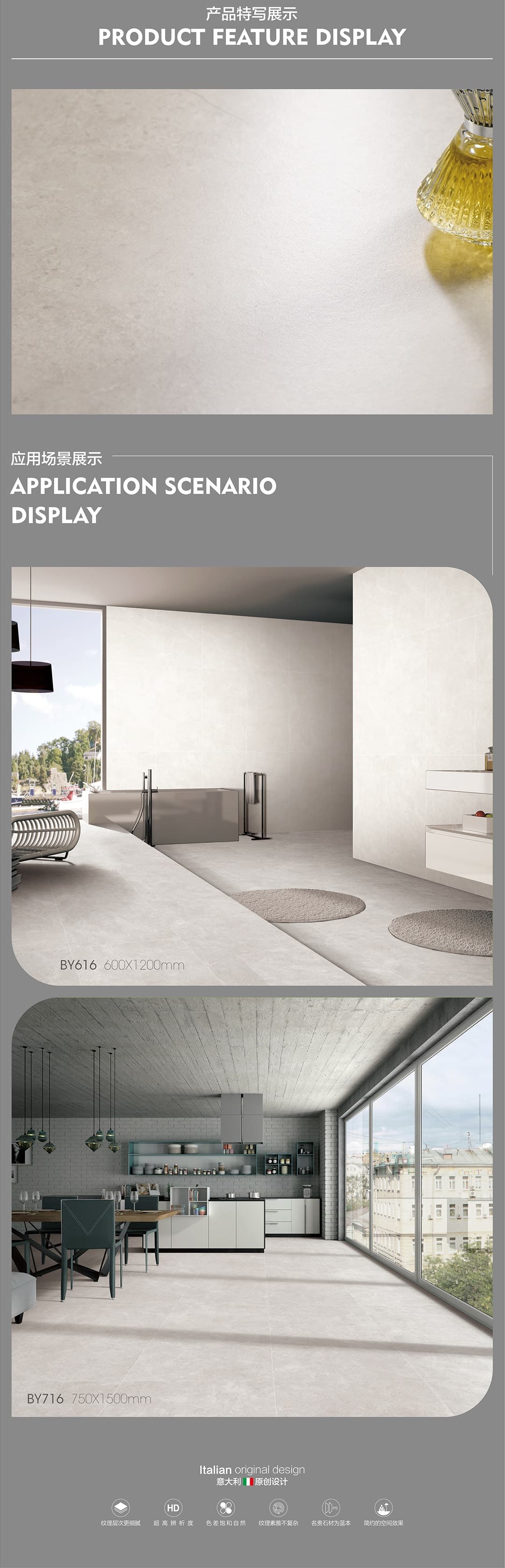 產(chǎn)品特性 表面柔和,防污效果強(qiáng),防滑R10指標(biāo)高,抗折強(qiáng)度好